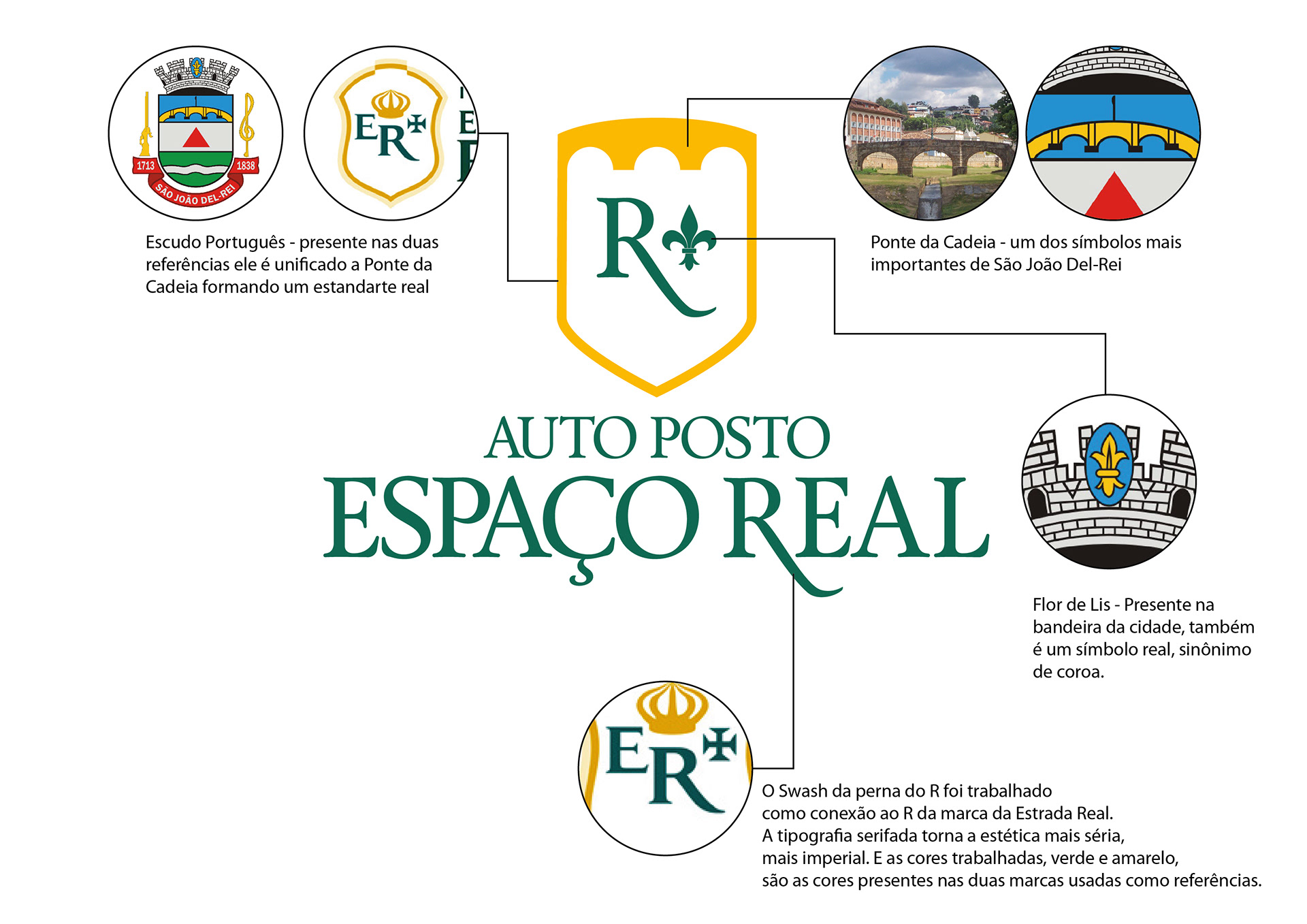 Marca criada para o Auto Posto Espaço Real, situado em São João Del-Rei/MG. A marca foi inspirada nos elementos da bandeira do município e a marca da Estrada Real, da qual a cidade faz parte. A marca foi criada para ser implantada no cartão fidelidade do posto.